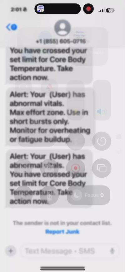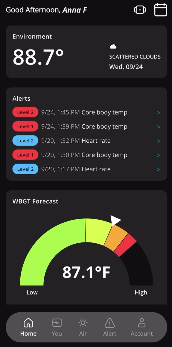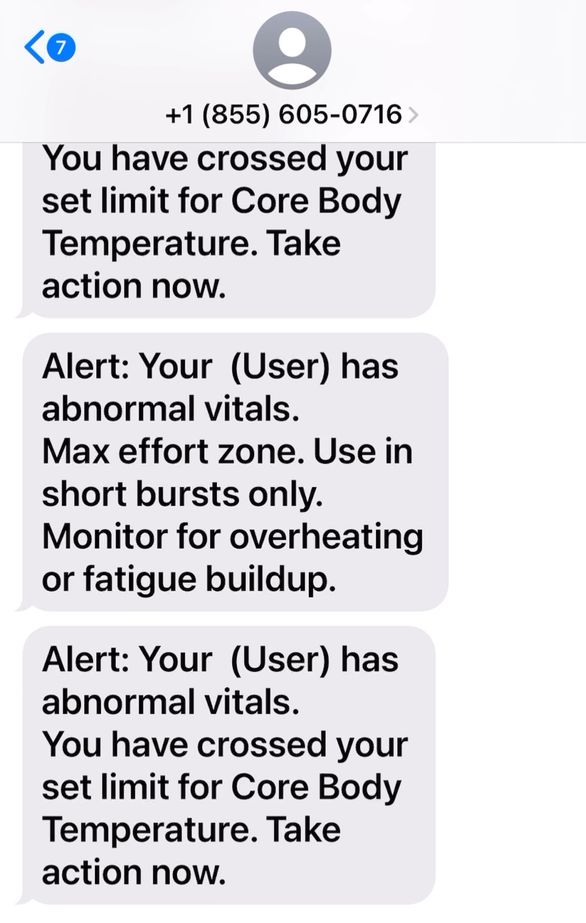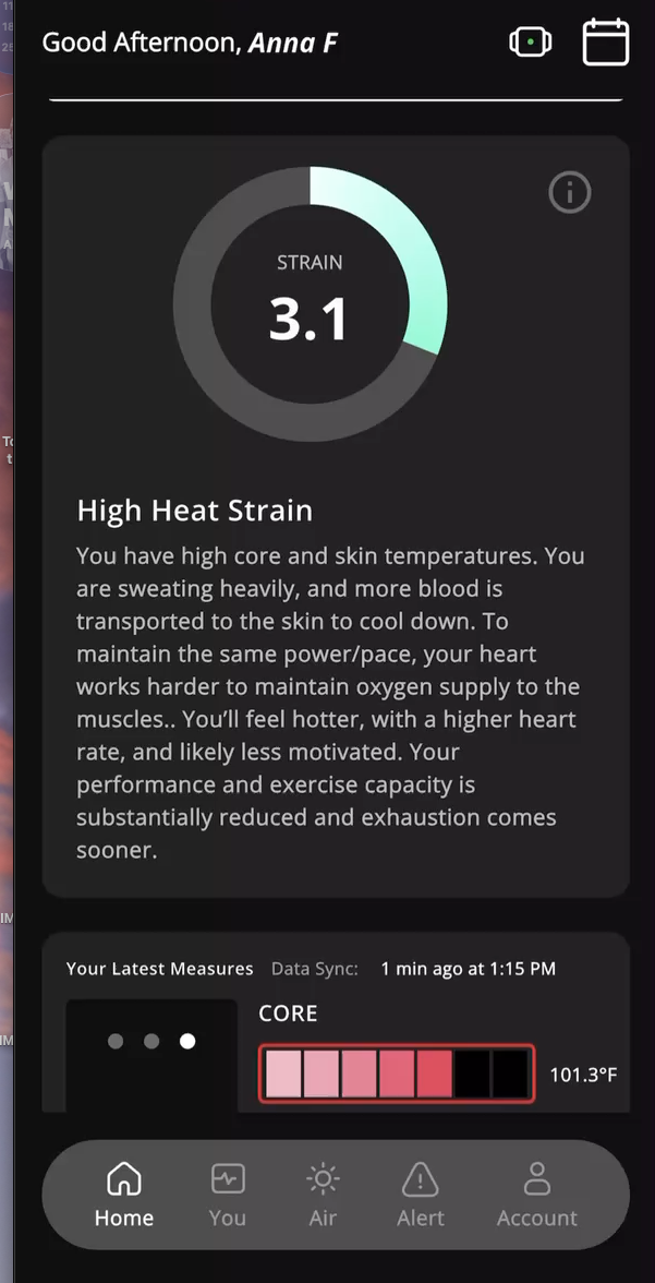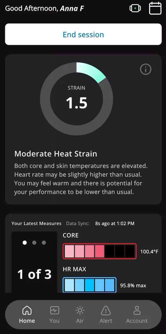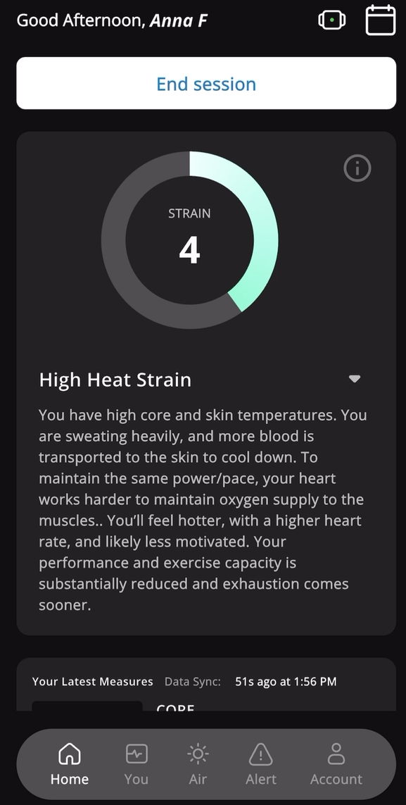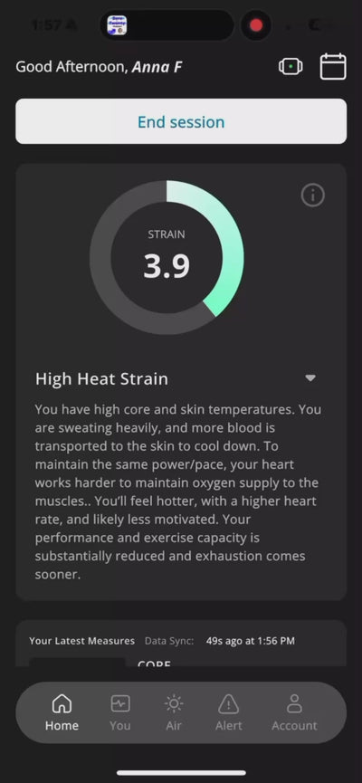 At strain level 3.1, HeatSense sent SMS alerts warning that core body temperature had crossed her set threshold. The athlete felt fine and kept pushing. After taking a few breaks and continuing the workout, heat strain level reached 4.0 and the symptoms finally caught up—fatigue, higher perceived effort, declining motivation.